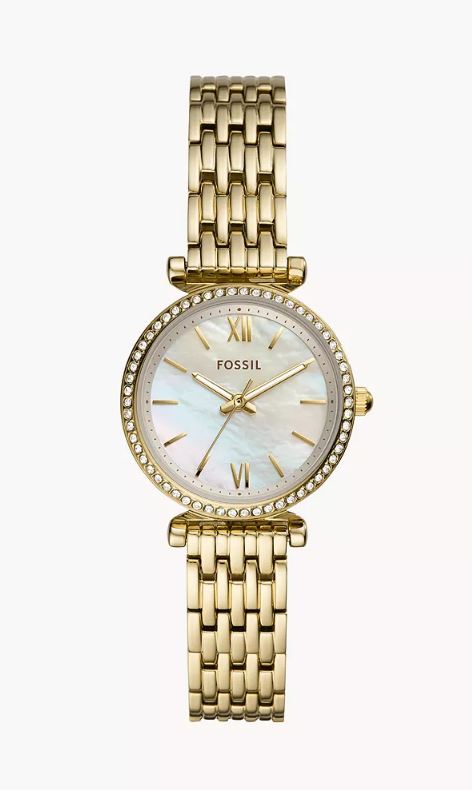 Fossil Ladies Mother of Pearl Yellow Plated Stainless Steel 3 Hand Crystal Watch