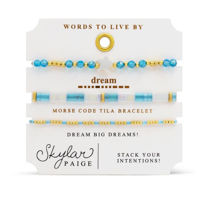 Stia Sterling Silver Gold Plated DREAM Light Blue and White Flower 3 Piece Stretch Bracelet Set
